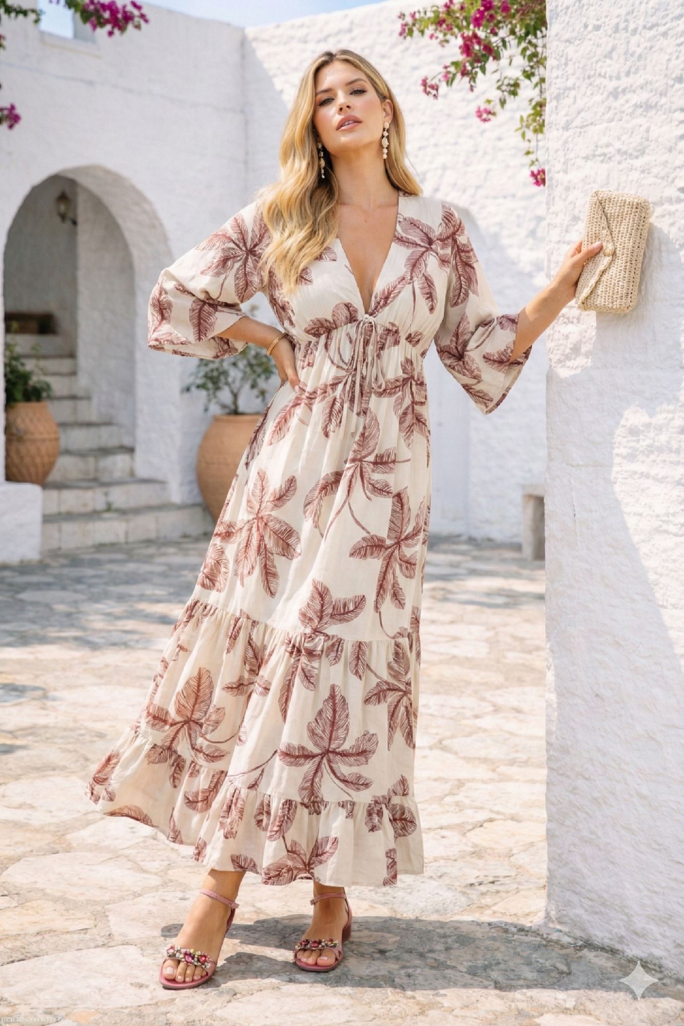 Μάξι Εμπριμέ Καφτάνι με Βαθύ V και Αέρινα Μανίκια