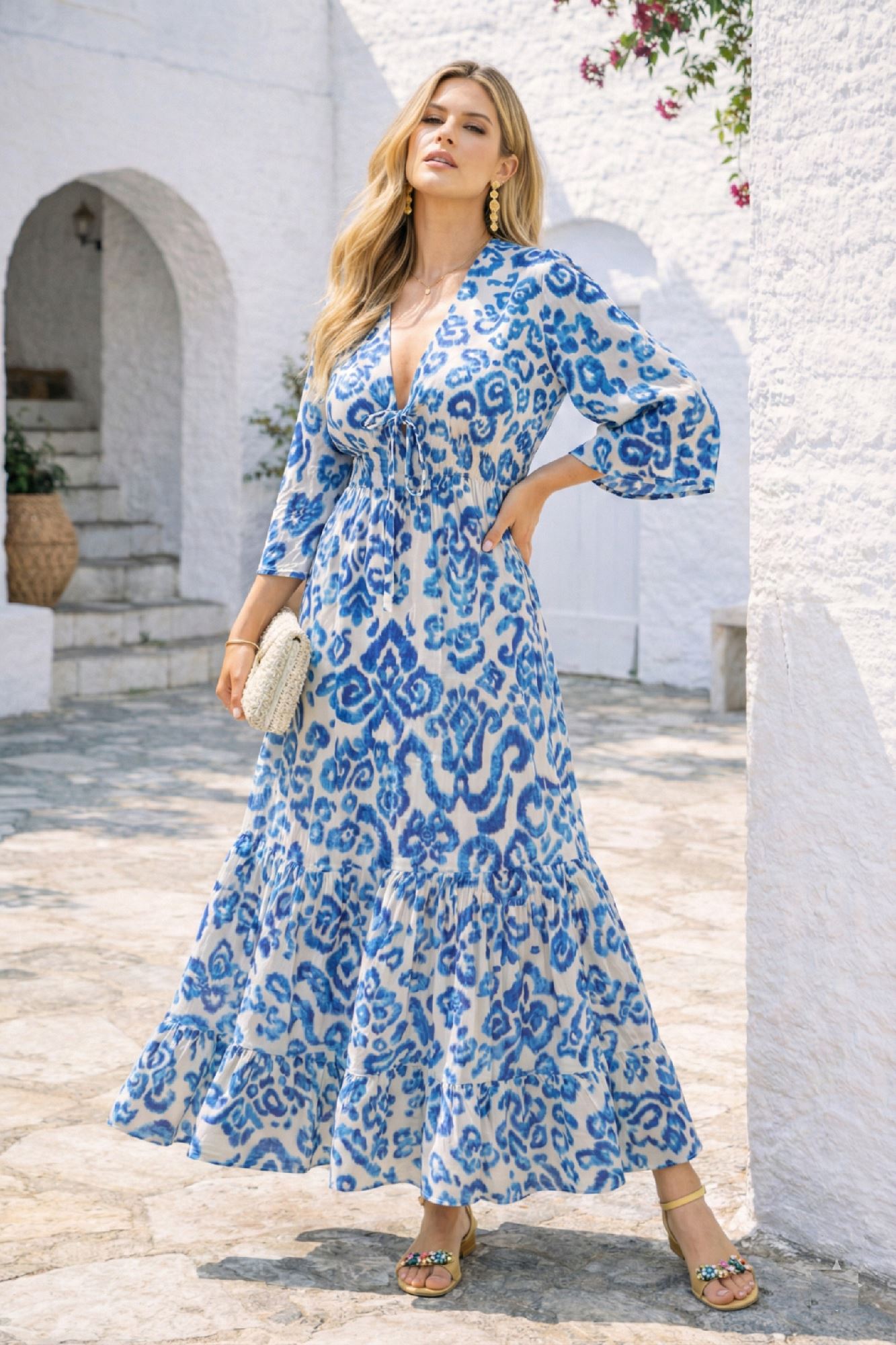 Μάξι Εμπριμέ Καφτάνι με Βαθύ V και Αέρινα Μανίκια