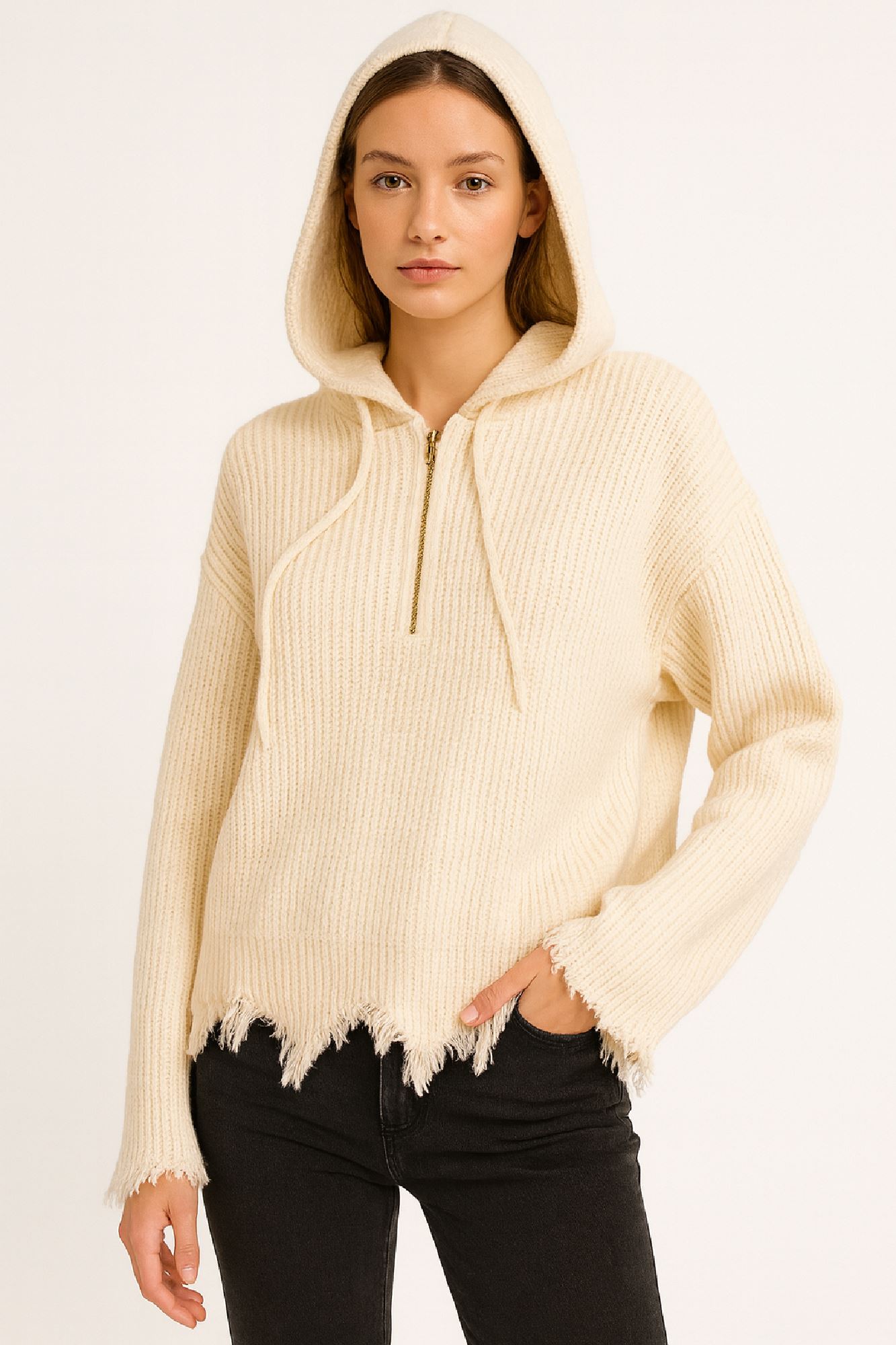 Πλεκτή Μπλούζα με Κουκούλα και Ξέφτια στα Τελειώματα