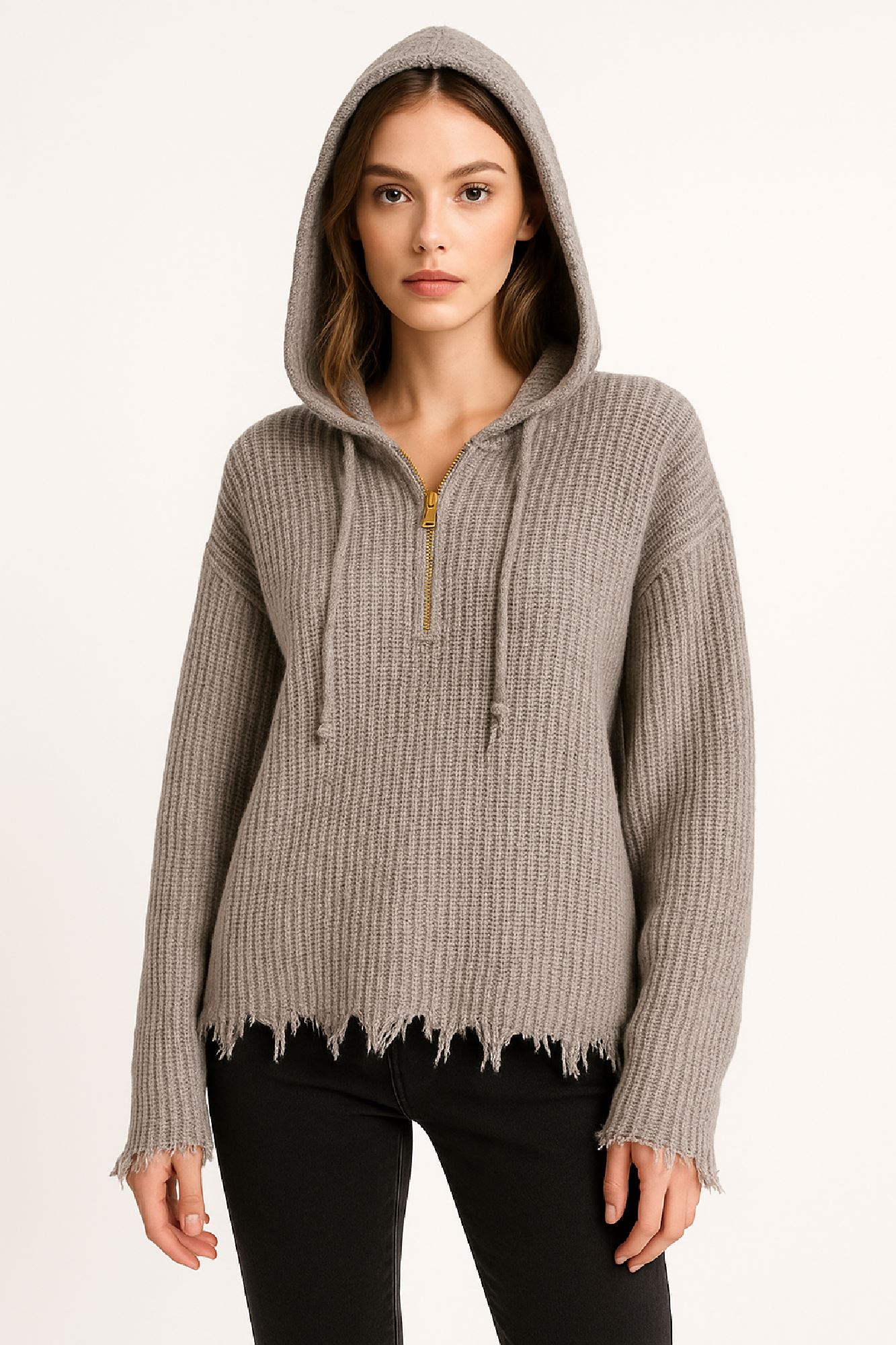 Πλεκτή Μπλούζα με Κουκούλα και Ξέφτια στα Τελειώματα
