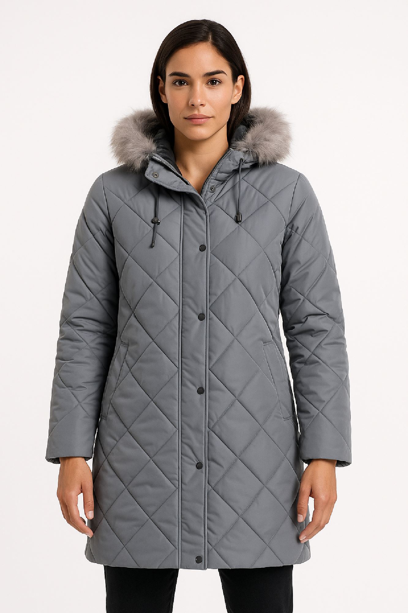 Long Quilted Coat with Faux Fur Hood
