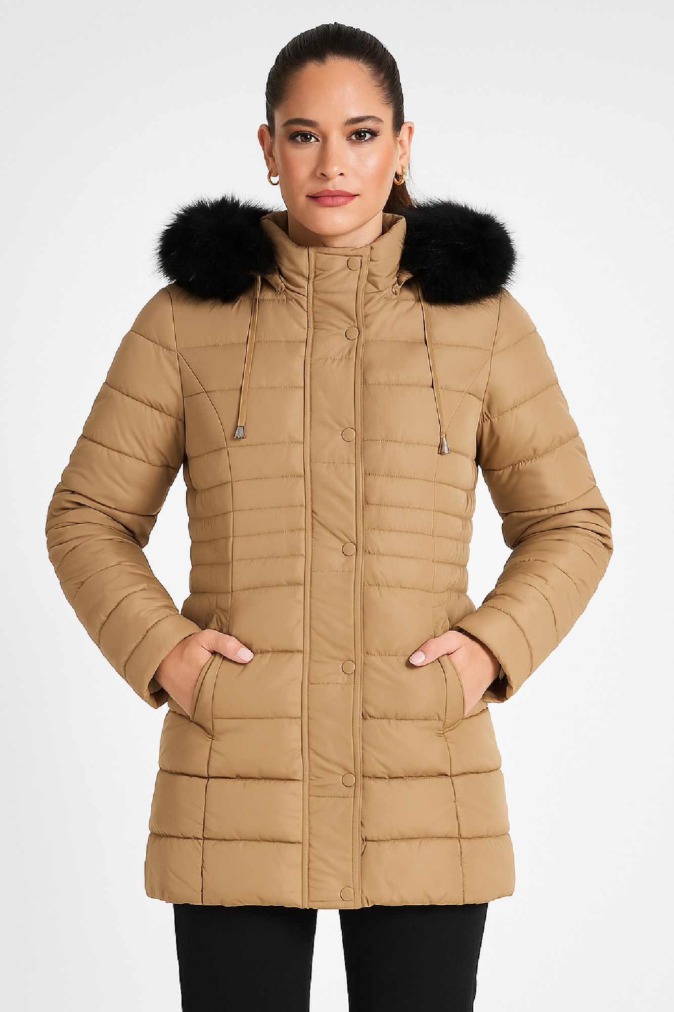 Quilted Puffer Jacket with Hood and Detachable Faux Fur Trim