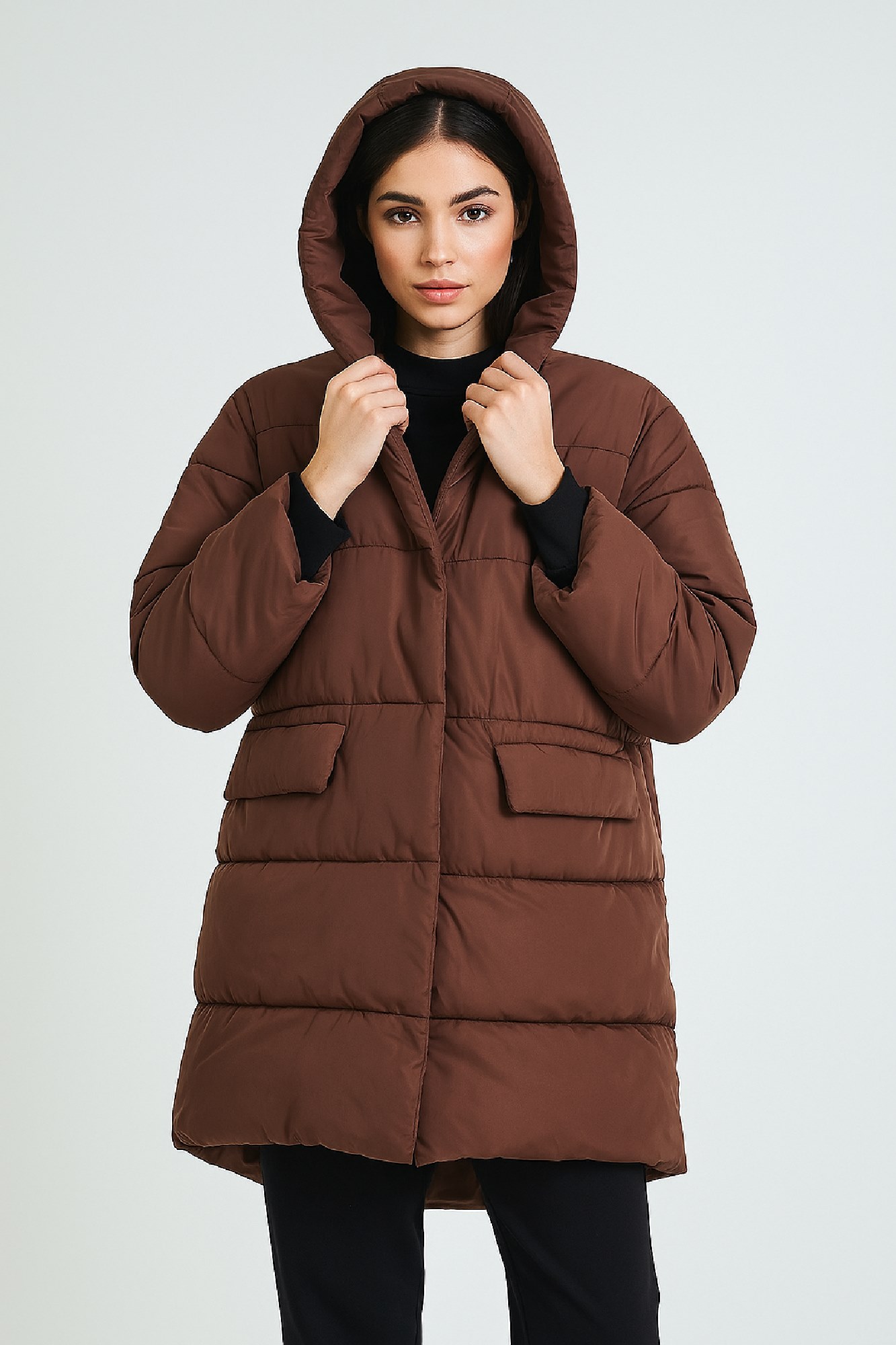 Long Quilted Puffer Jacket with Hood and Flap Pockets